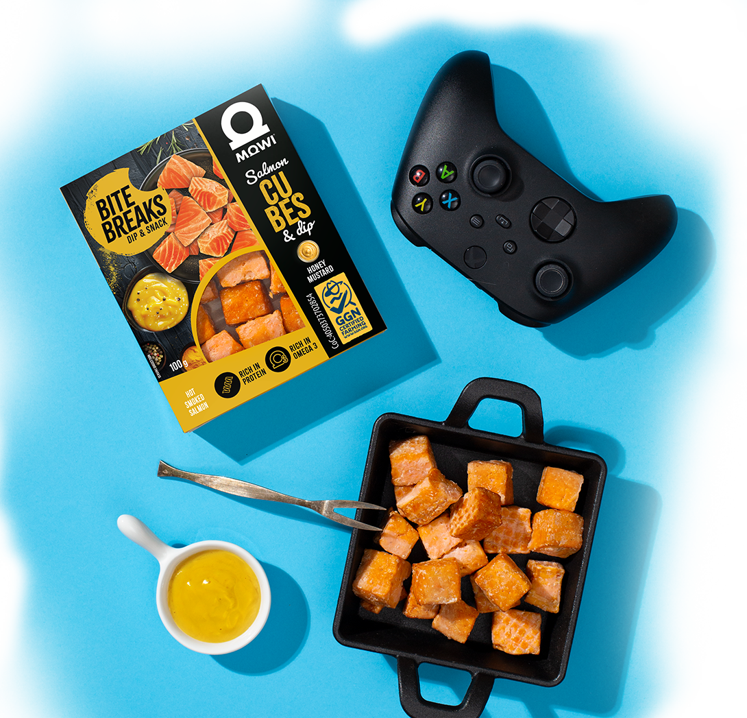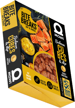 MOWI Bite Breaks to pełne smaku kostki z łososia wędzonego na gorąco z pysznym, miodowo-musztardowym sosem!