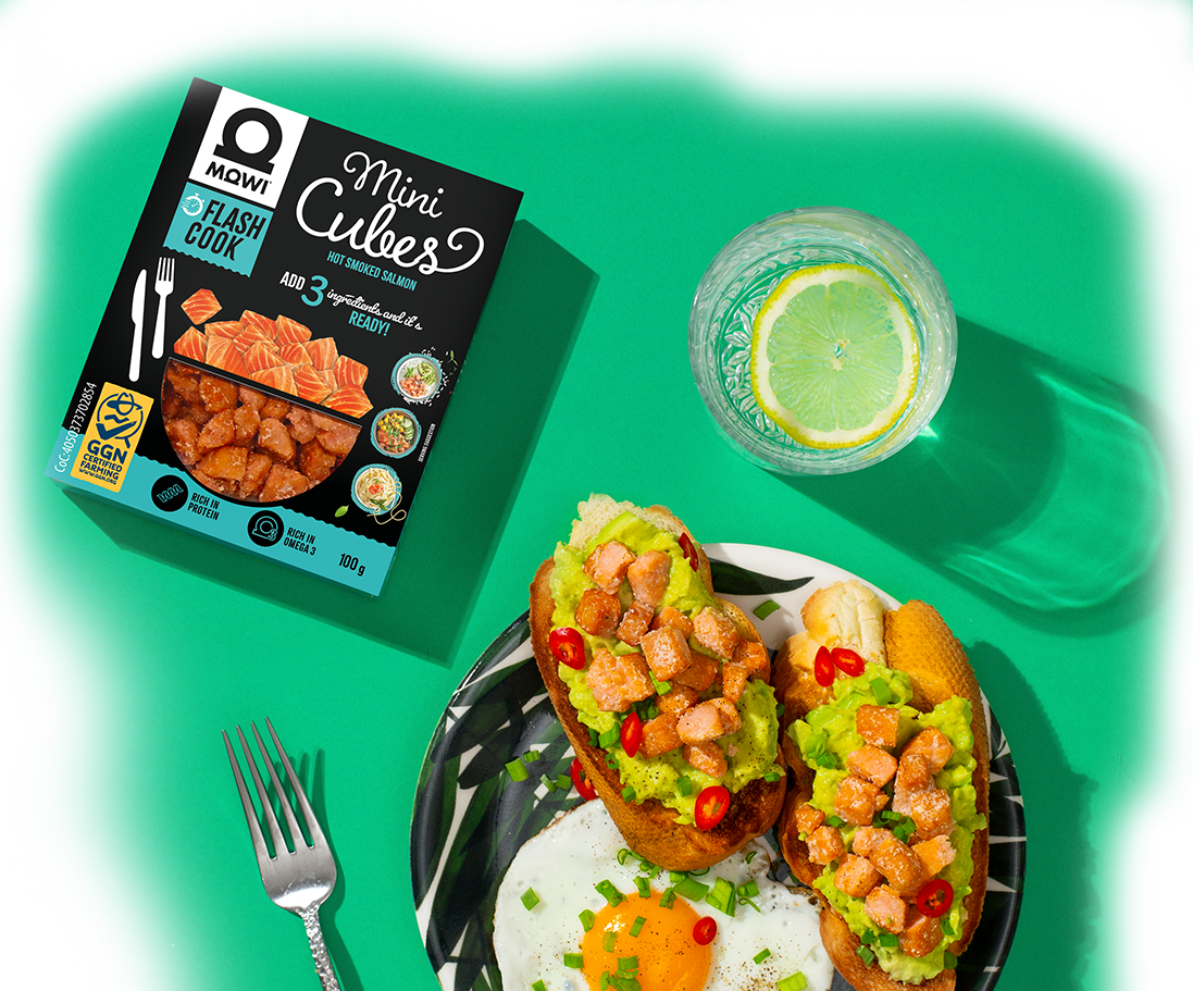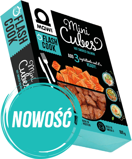 Gotowe do jedzenia, gotowe do gotowania. Kostki Flash Cook nadają się do salatek, kanapek, omletów, makaronów… i pełnych obiadów! Są tak inspirujące, że zalożymy się, że ktoś upiekł z nimi ciasto! MOWI Flash Cook to kostki z łososia wędzonego na gorąco w bukowym dymie, pełne protein, witamin i mikroelementów!