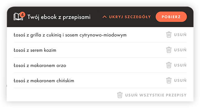 Zakładka umożliwia zarządzanie listą przepisów, a klawisz “Pobierz” pozwala na ściągnięcie Twojej książki.
